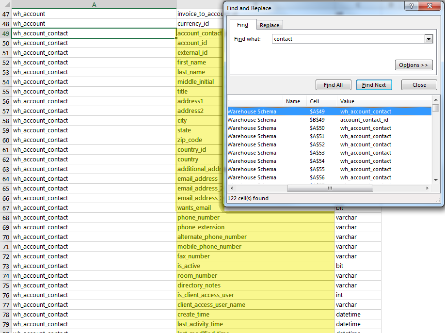 - In the Find and Replace dialog, in the Find what: field, enter the column name to search, or a key word in the column name.